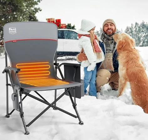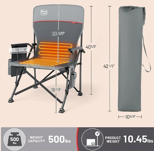 કસ્ટમ ગરમ ફોલ્ડિંગ ખુરશી, પીઠ અને સીટ માટે ડ્યુઅલ હીટિંગ ઝોન ફક્ત 10 સેકંડમાં 131 ° F સુધી ગરમ થાય છે. ત્રણ હીટ સેટિંગ્સ (104 ° F, 122 ° F, 131 ° F) કોઈપણ આઉટડોર પ્રસંગ માટે હૂંફ પ્રદાન કરે છે (બેટરી શામેલ નથી).