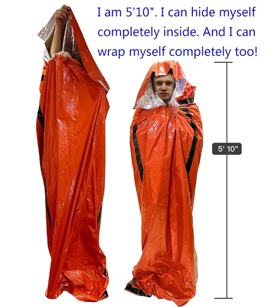 ઇમરજન્સી સર્વાઇવલ સ્લીપિંગ બેગ, બધા હવામાન, તમામ asons તુઓ અને તમામ સંજોગોમાં તમારા અસ્તિત્વની તકોમાં વધારો કરી શકે છે. તે અવકાશ સંશોધન માટે નાસા દ્વારા રચાયેલ ટકાઉ ઇન્સ્યુલેટીંગ માયલર સામગ્રીથી બનેલું છે. તે શરીરની 90% ગરમી જાળવી રાખે છે / પ્રતિબિંબિત કરે છે. તે ફરીથી વાપરી શકાય તેવું, વોટરપ્રૂફ અને વિન્ડપ્રૂફ છે.
