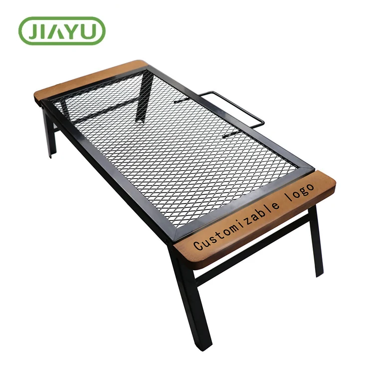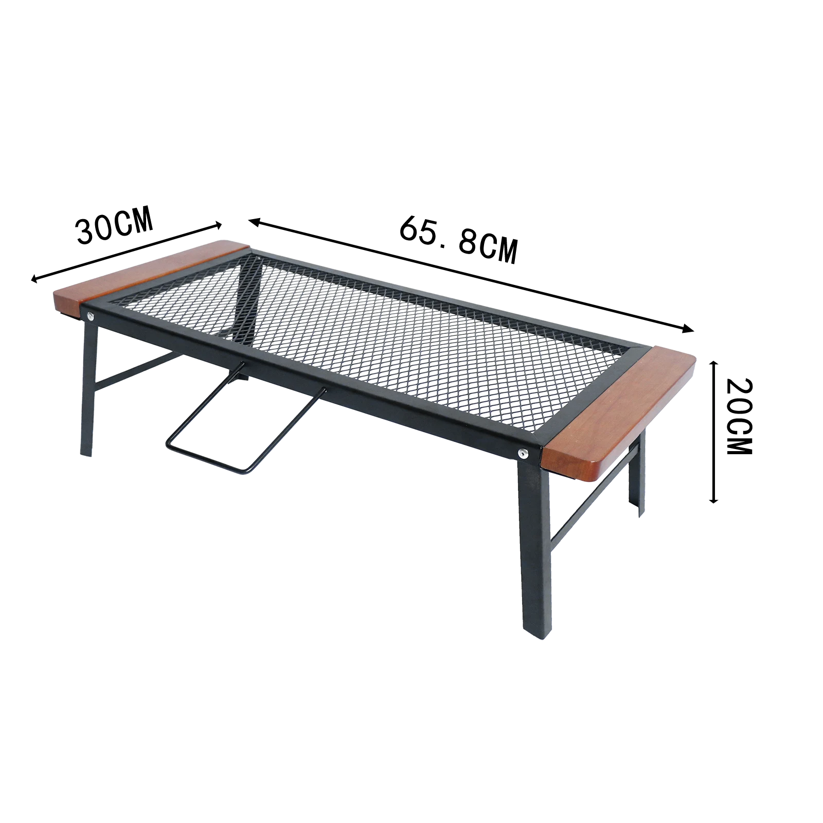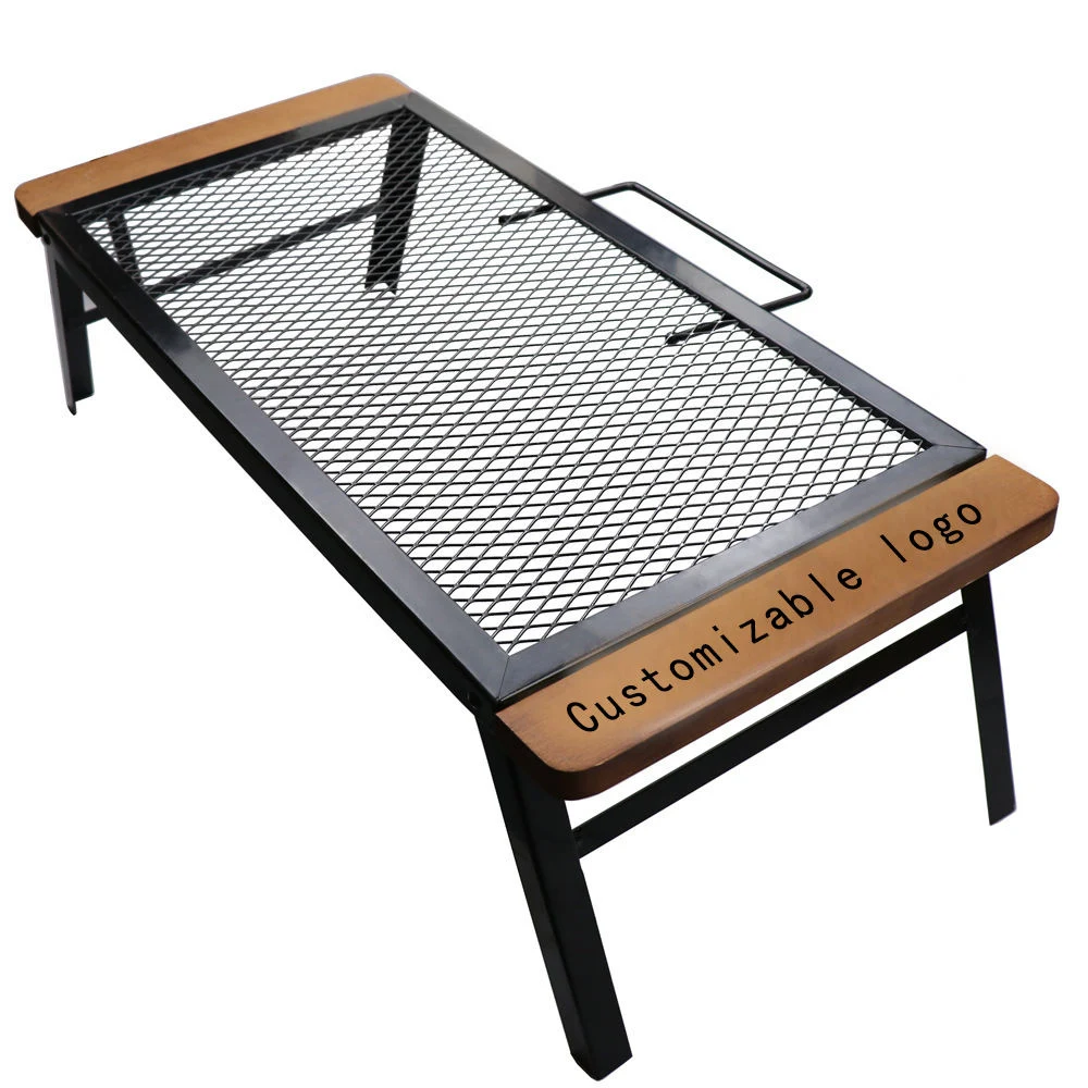 ફોલ્ડેબલ આયર્ન આઉટડોર કેમ્પિંગ ટેબલ, આઉટડોર એન્ટી-સ્કેલિંગ લાકડાના હેન્ડલ કેમ્પિંગ બરબેકયુ આયર્ન ટેબલ અનુકૂળ ફોલ્ડિંગ નેટ કેમ્પિંગ ટેબલ
