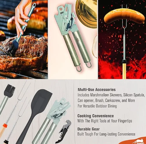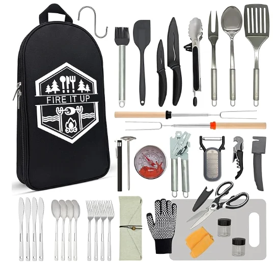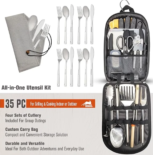 આઉટડોર કેમ્પિંગ કૂકવેર સ્ટોરેજ બેગ આ 35 પીસી કેમ્પિંગ રસોઈ વાસણો સેટ તમારી આઉટડોર રસોઈ આવશ્યકતાઓ માટે એક સંપૂર્ણ સોલ્યુશન છે. તેમાં કેમ્પિંગ કિચન સેટ અને કેમ્પિંગ વાસણો રસોઈ સેટ શામેલ છે, બધાં વધારાના ભાગો અને બે પાછલા ખિસ્સાવાળી કસ્ટમ બેગમાં સરસ રીતે ભરેલા છે. સેટ તમારા બધા કેમ્પિંગ રસોઈની આવશ્યકતાઓને પૂરી કરવા માટે બનાવવામાં આવ્યો છે, તેને તમારા કેમ્પિંગ ગિયરમાં અનિવાર્ય ઉમેરો બનાવે છે