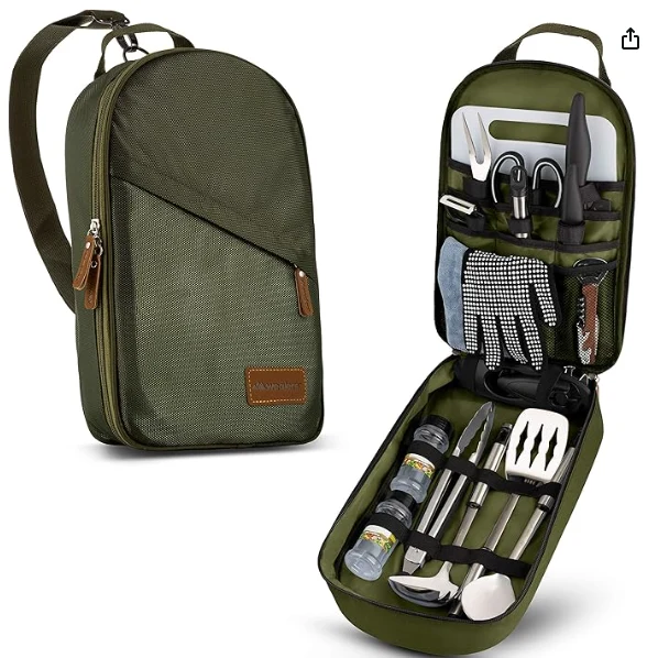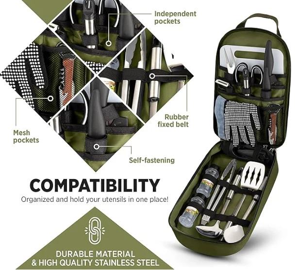 પોર્ટેબલ આઉટડોર કેમ્પિંગ ટૂલ બેગ, દરેક વાસણોની પોતાની નિયુક્ત પાઉચ હોય છે, તેથી એકમો સ્ટોરેજમાં અથવા પરિવહનમાં ગંધ, ખંજવાળી અથવા નુકસાન પહોંચાડતા નથી. તમારા રસોઈનાં વાસણોની સરળ provide ક્સેસ પ્રદાન કરે છે અને તે સુરક્ષિત ઝિપ સીલથી સજ્જ છે